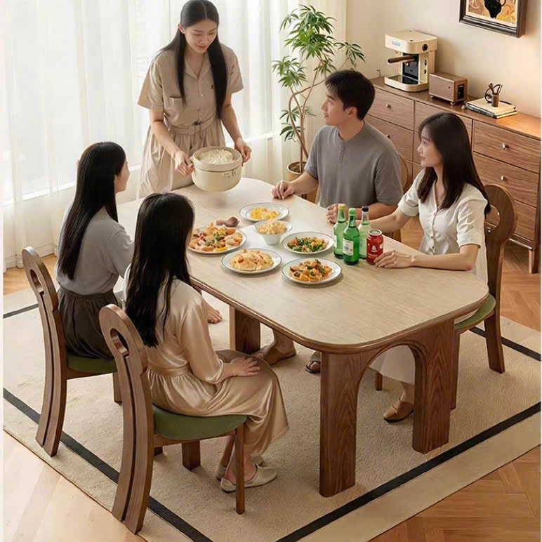 + Bàn mặt chữ nhật bo góc tròn, chất liệu mặt gỗ hoặc đá ceramic