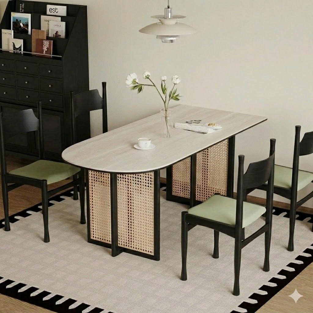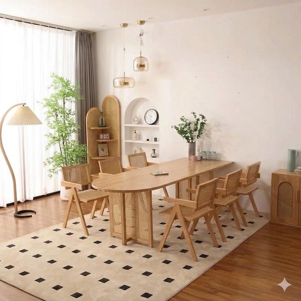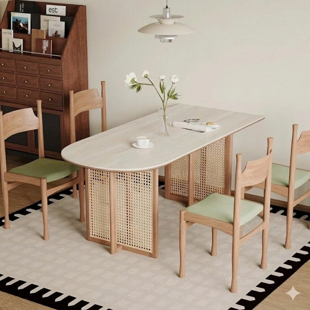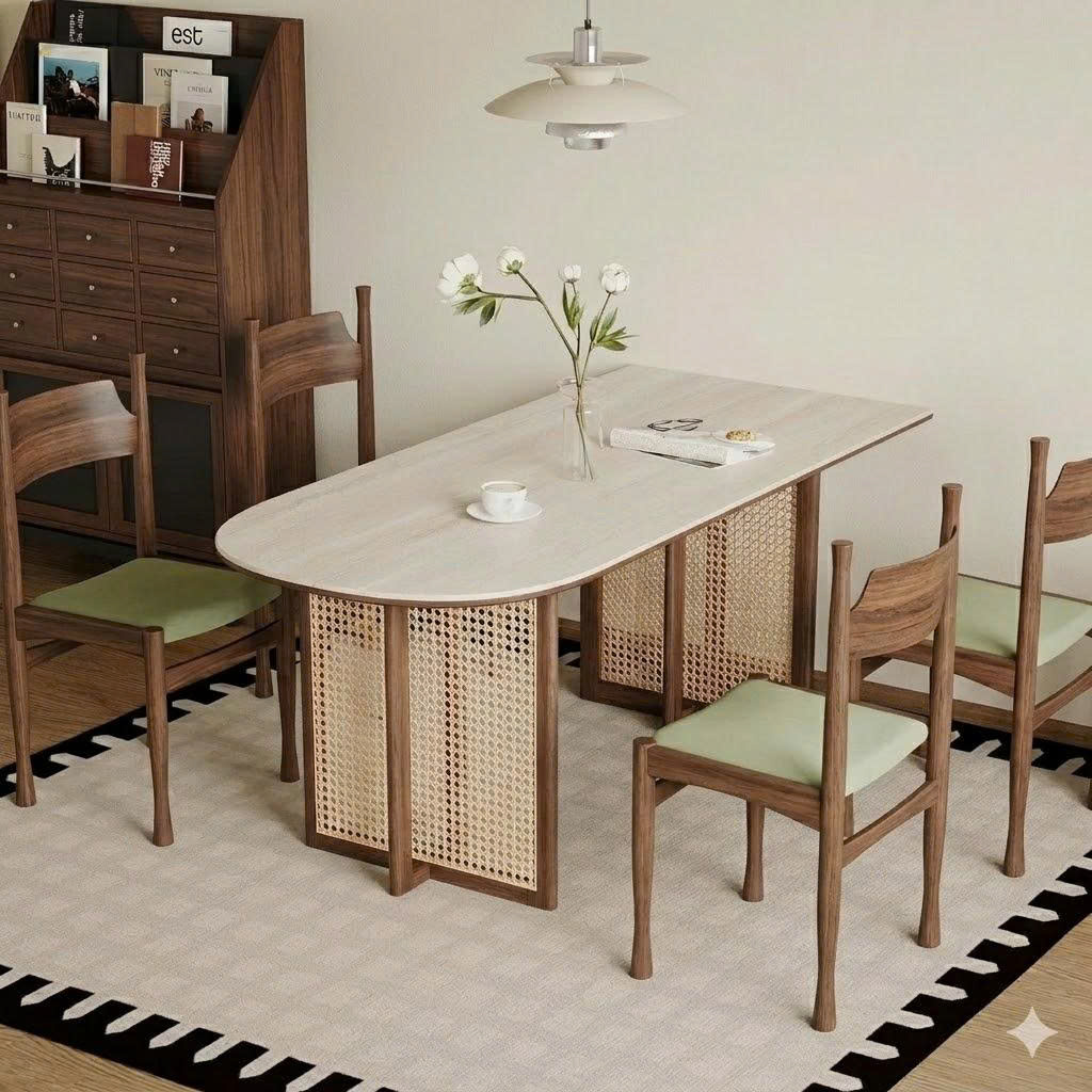 Bàn Ăn Gỗ Phối Mây VBA03 Phong Cách Japandi – Bàn Ăn Oval Cao Cấp 4-6 Ghế, Gỗ Tự Nhiên Kết Hợp Mây Đan Tinh Tế