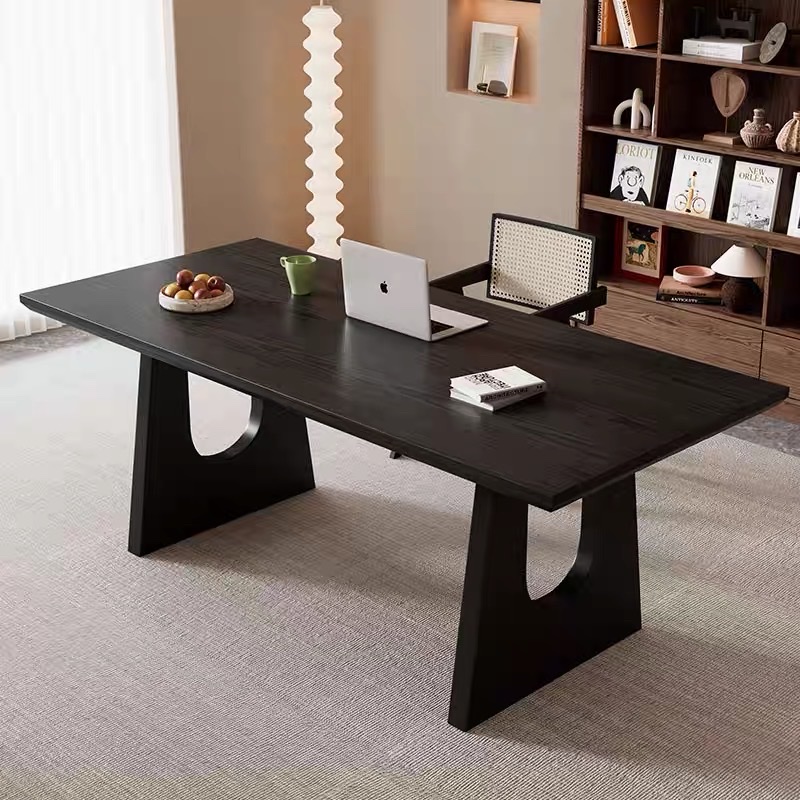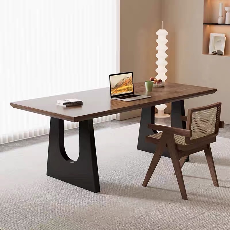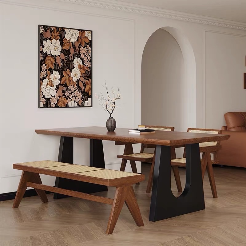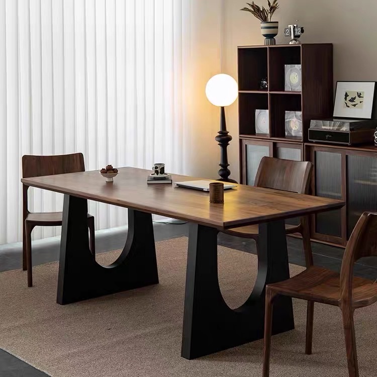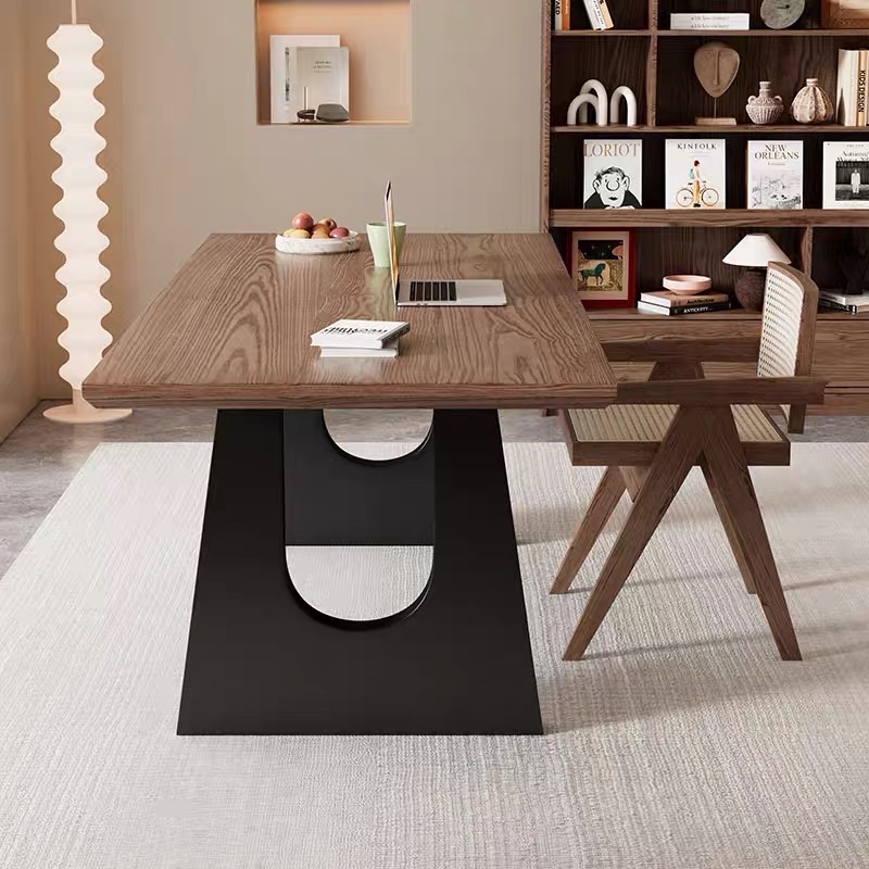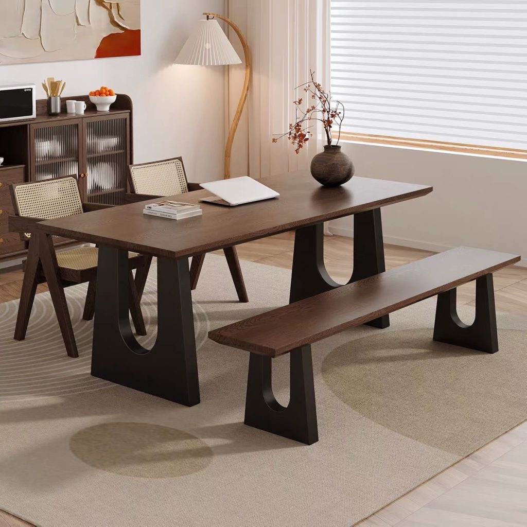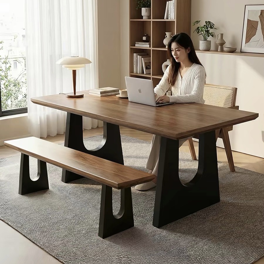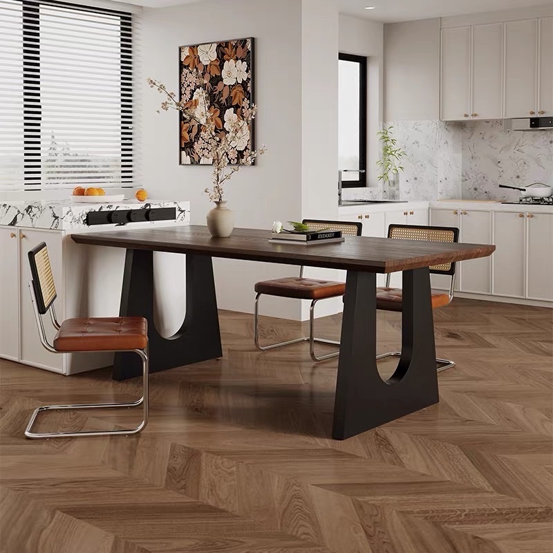 Mặt bàn rộng rãi, phẳng mịn được gia công kỹ lưỡng giúp chống trầy xước nhẹ, dễ lau chùi và phù hợp cho nhu cầu sử dụng hằng ngày như ăn uống, tiếp khách hoặc làm việc. Điểm nhấn đặc biệt nằm ở phần chân bàn dạng khung chữ U cách điệu, sơn đen mạnh mẽ, không chỉ đảm bảo độ vững chắc mà còn mang đến vẻ đẹp cá tính, hiện đại cho không gian nội thất.