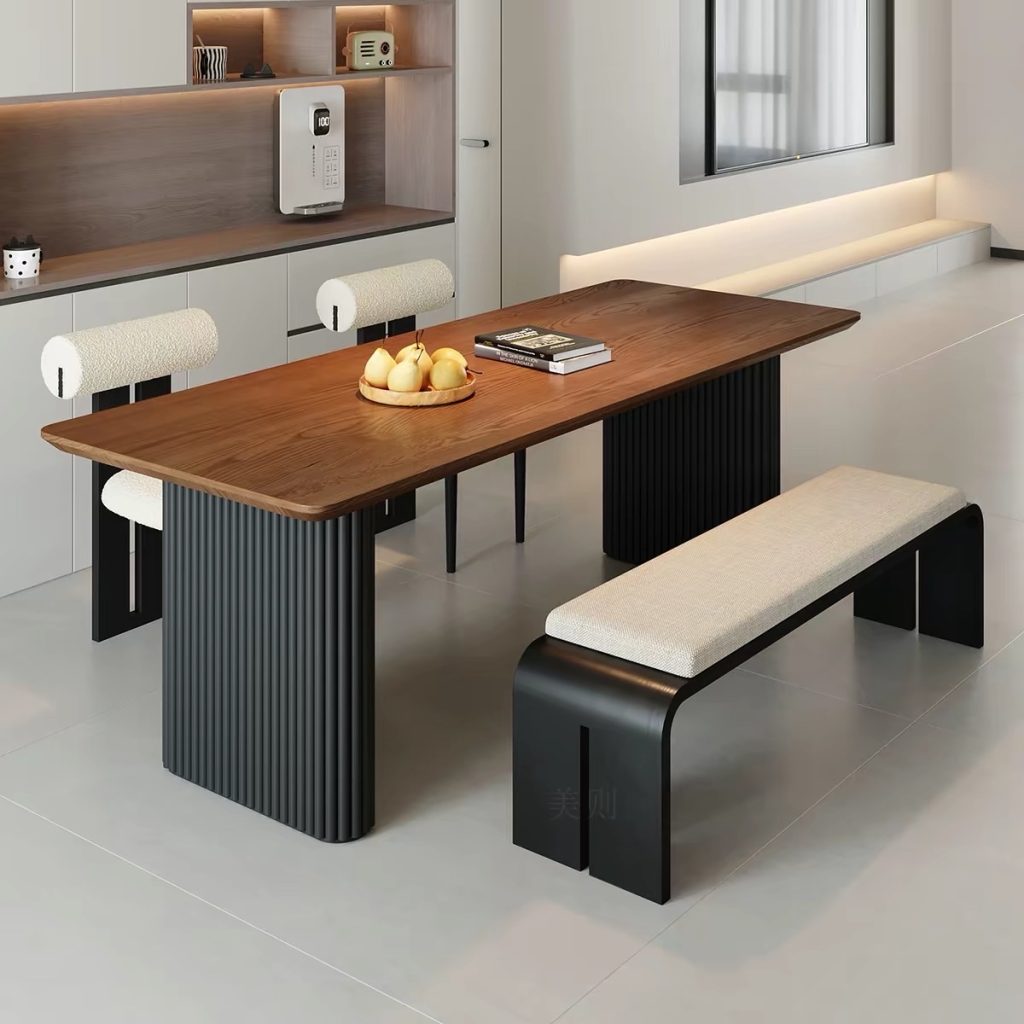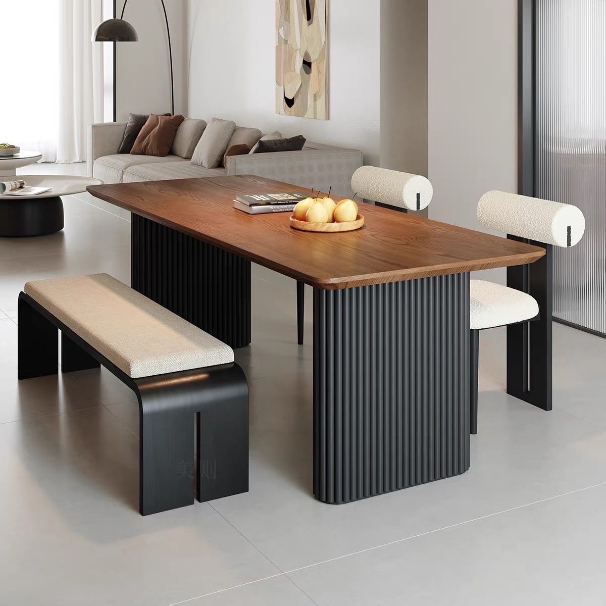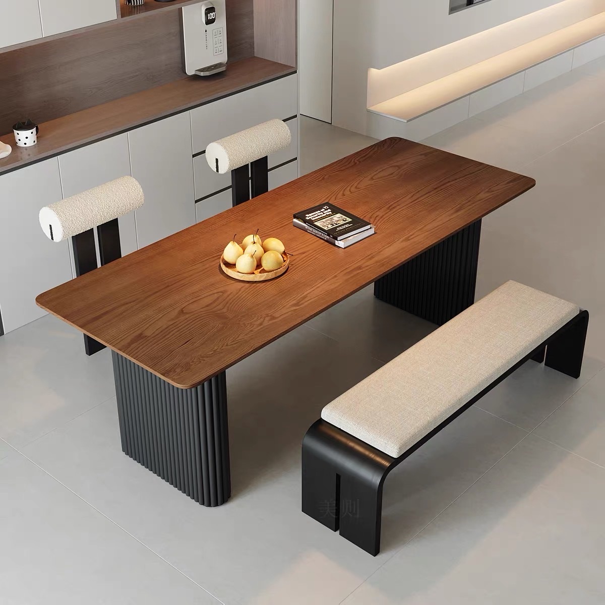 Thiết kế 2 chân trụ lớn giúp bàn đứng vững, chịu lực tốt, đồng thời tạo điểm nhấn khác biệt so với các mẫu bàn truyền thống. Các chi tiết nan gỗ được gia công tỉ mỉ, mang hơi hướng phong cách Modern Art Decor, phù hợp với những không gian yêu cầu tính thẩm mỹ cao như phòng khách, phòng ăn, studio hoặc showroom. Tông màu nâu gỗ trầm ấm giúp dễ dàng phối hợp với nhiều phong cách nội thất như hiện đại, tối giản, Japandi hay luxury.