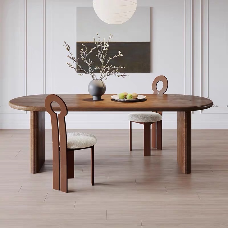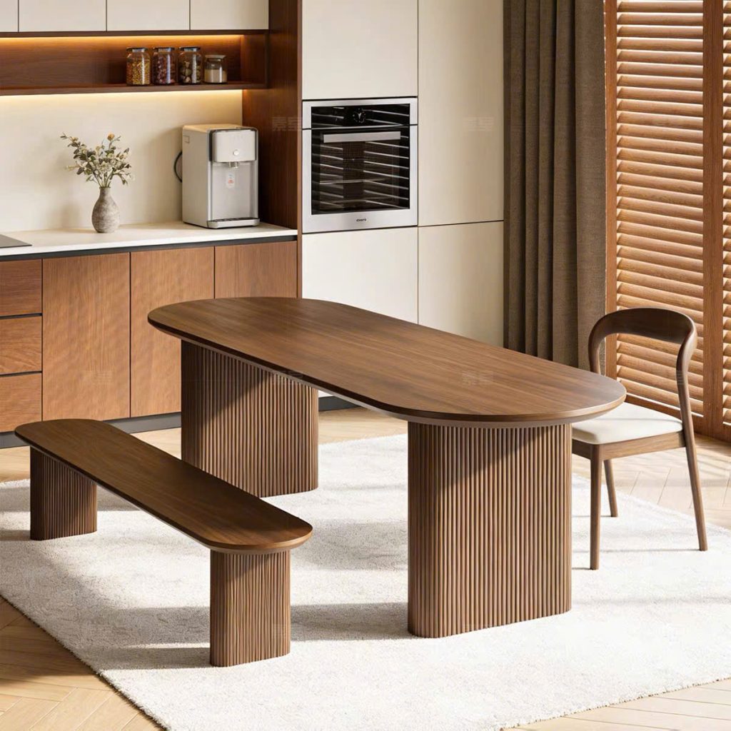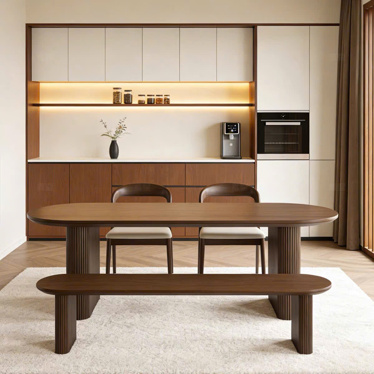 Thiết kế 2 chân trụ lớn giúp bàn đứng vững, chịu lực tốt, đồng thời tạo điểm nhấn khác biệt so với các mẫu bàn truyền thống. Các chi tiết nan gỗ được gia công tỉ mỉ, mang hơi hướng phong cách Modern Art Decor, phù hợp với những không gian yêu cầu tính thẩm mỹ cao như phòng khách, phòng ăn, studio hoặc showroom. Tông màu nâu gỗ trầm ấm giúp dễ dàng phối hợp với nhiều phong cách nội thất như hiện đại, tối giản, Japandi hay luxury.