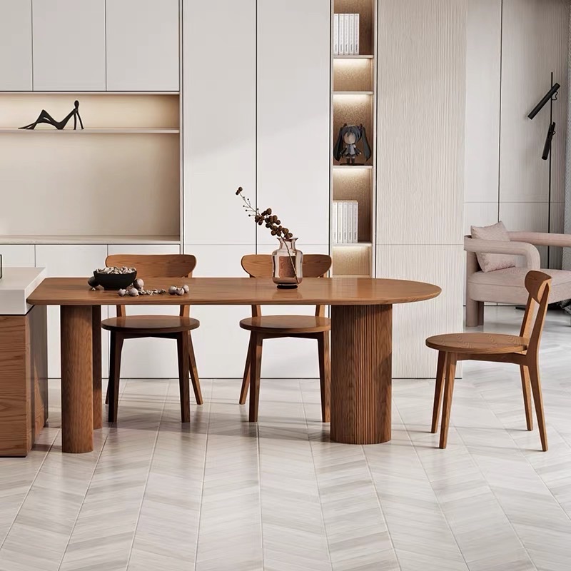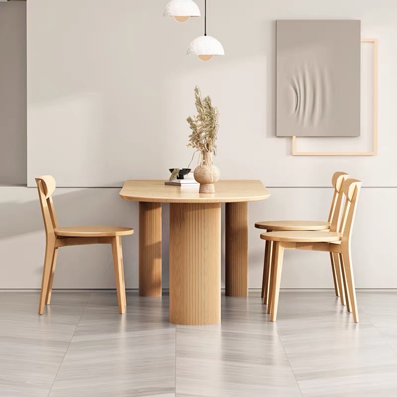Thiết kế 3 chân trụ lớn giúp bàn đứng vững, chịu lực tốt, đồng thời tạo điểm nhấn khác biệt so với các mẫu bàn truyền thống. Các chi tiết nan gỗ được gia công tỉ mỉ, mang hơi hướng phong cách Modern Art Decor, phù hợp với những không gian yêu cầu tính thẩm mỹ cao như phòng khách, phòng ăn, studio hoặc showroom. Tông màu nâu gỗ trầm ấm giúp dễ dàng phối hợp với nhiều phong cách nội thất như hiện đại, tối giản, Japandi hay luxury.