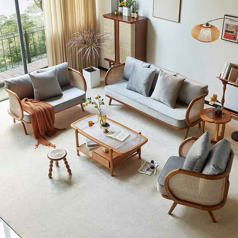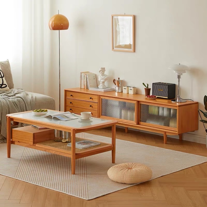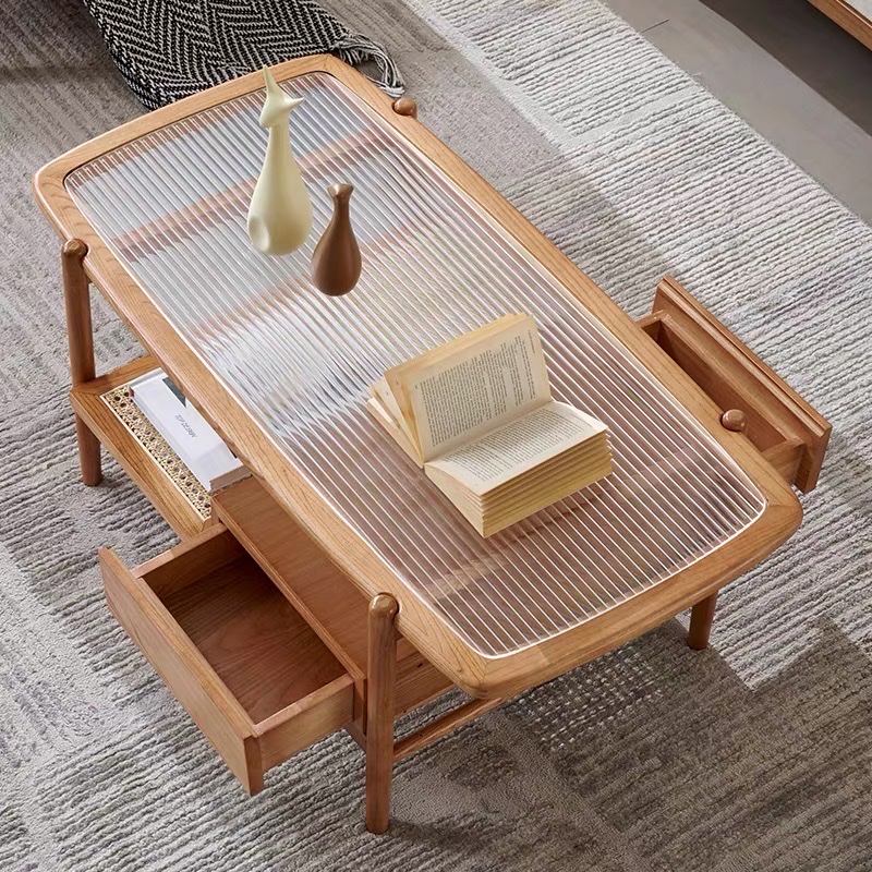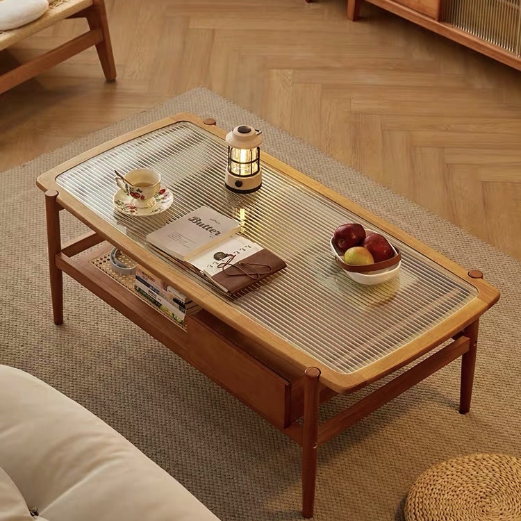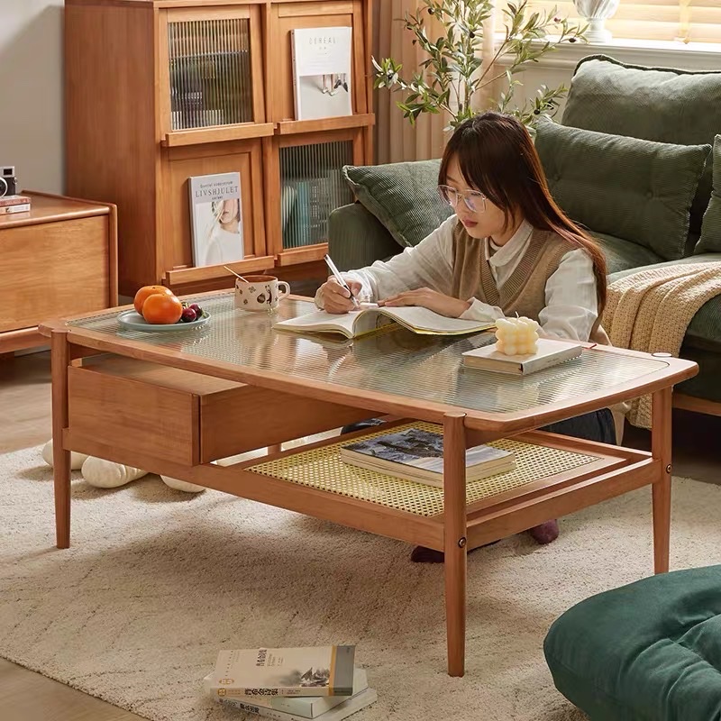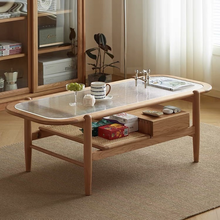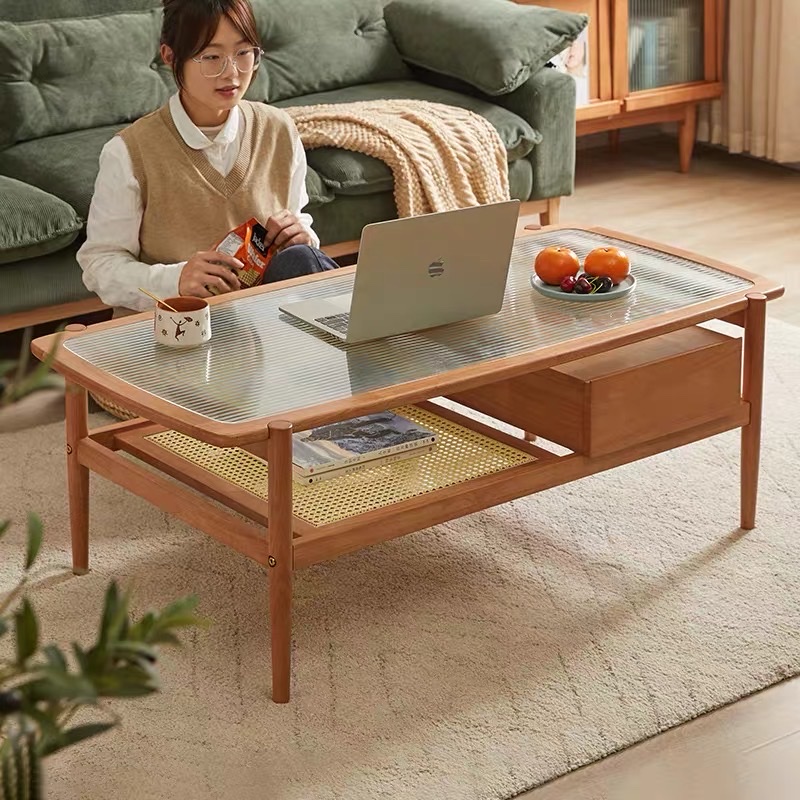 Bàn Trà Sofa Gỗ VBT19 Phong Cách Japandi – Bàn Sofa Mặt Kính Gân Cao Cấp, Kệ Mây Tiện Lợi, Thiết Kế Hiện Đại Tối Giản