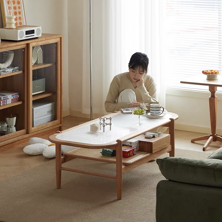 >Phần kệ dưới kết hợp mây đan thoáng khí, mang lại điểm nhấn tự nhiên và tiện lợi để sách, tạp chí hoặc đồ decor. Ngăn kéo bên hông giúp tối ưu không gian lưu trữ, giữ phòng khách luôn gọn gàng.