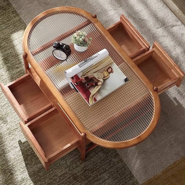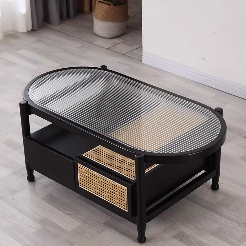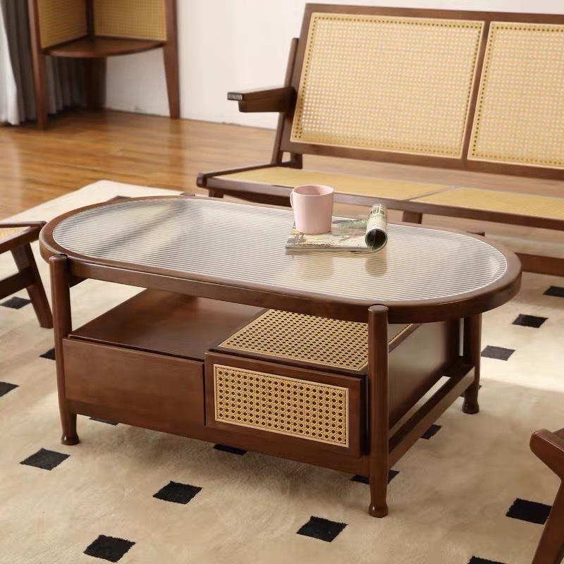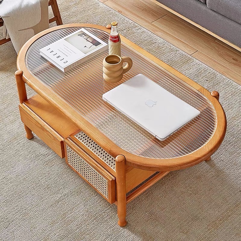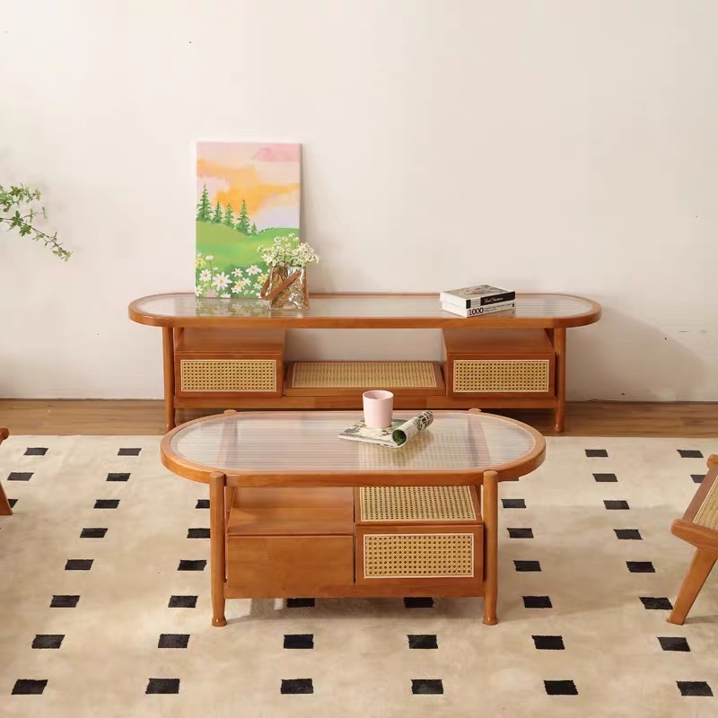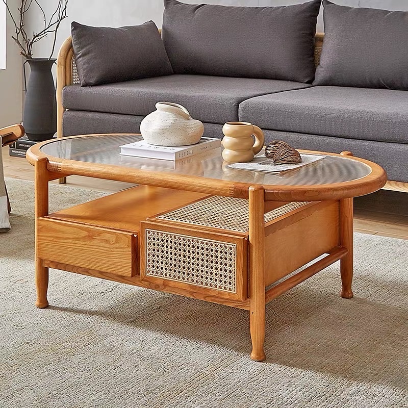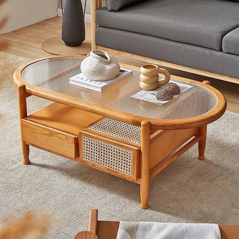Bàn Trà Sofa Gỗ VBT20 Phong Cách Scandinavian Indochine – Bàn Sofa Mặt Kính Gân Oval Cao Cấp, Kệ Mây Tiện Lợi, Thiết Kế Hiện Đại Tối Giản