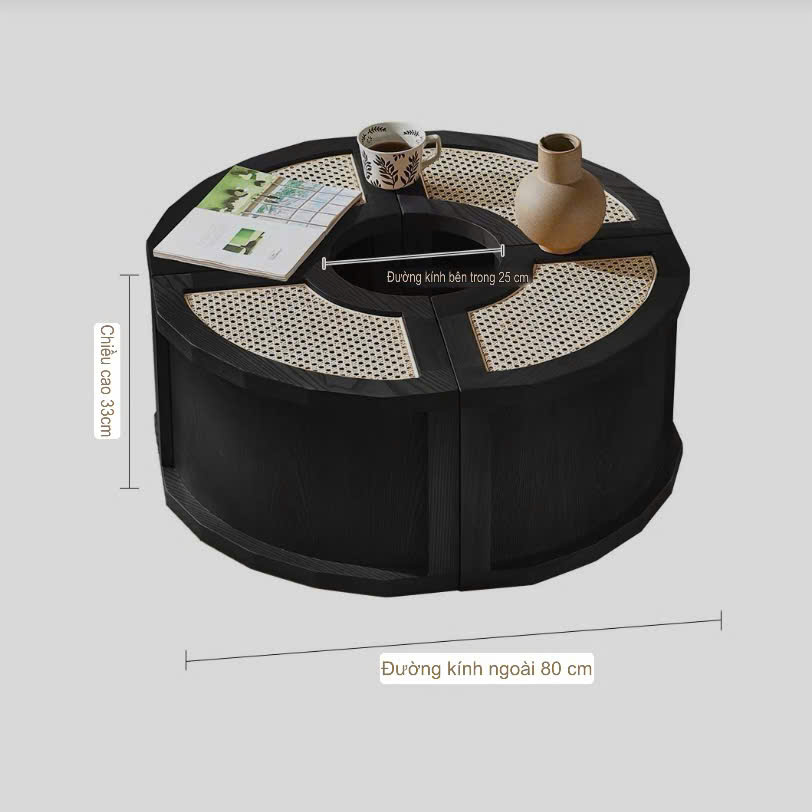 >Phần kệ dưới kết hợp mây đan thoáng khí, mang lại điểm nhấn tự nhiên và tiện lợi để sách, tạp chí hoặc đồ decor. Ngăn kéo bên hông giúp tối ưu không gian lưu trữ, giữ phòng khách luôn gọn gàng.