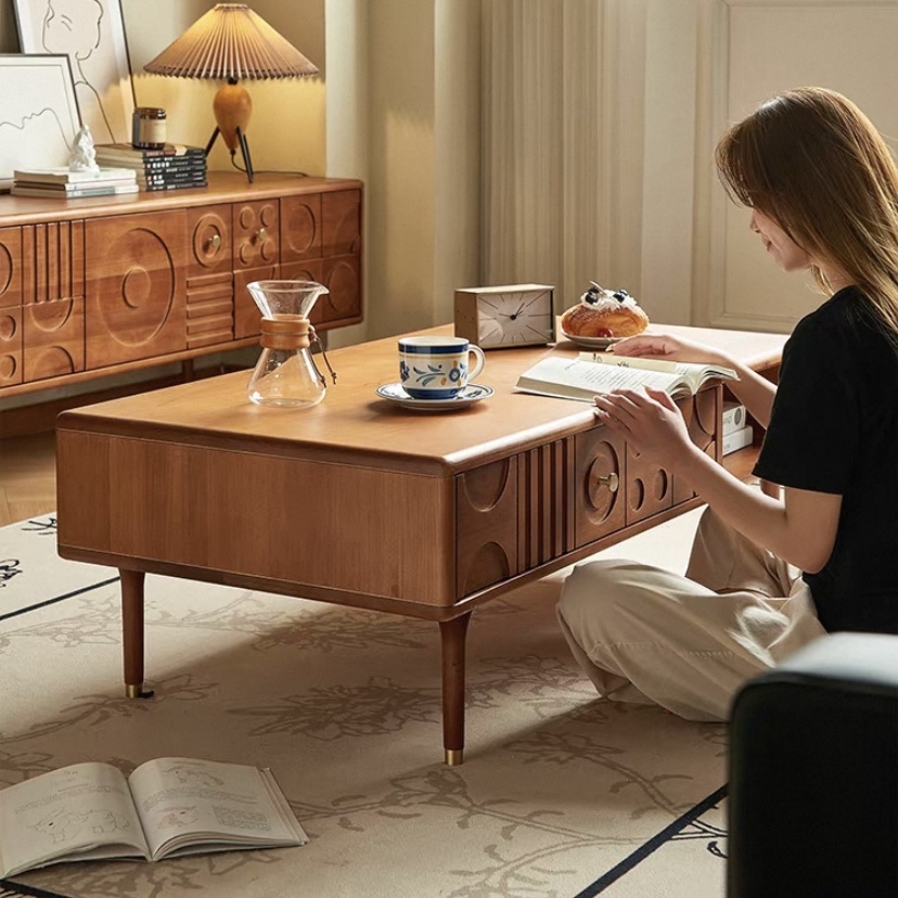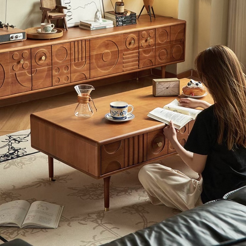 Thiết kế: Ngăn kéo chạm khắc họa tiết hình học + khoang chứa mở tiện lợi