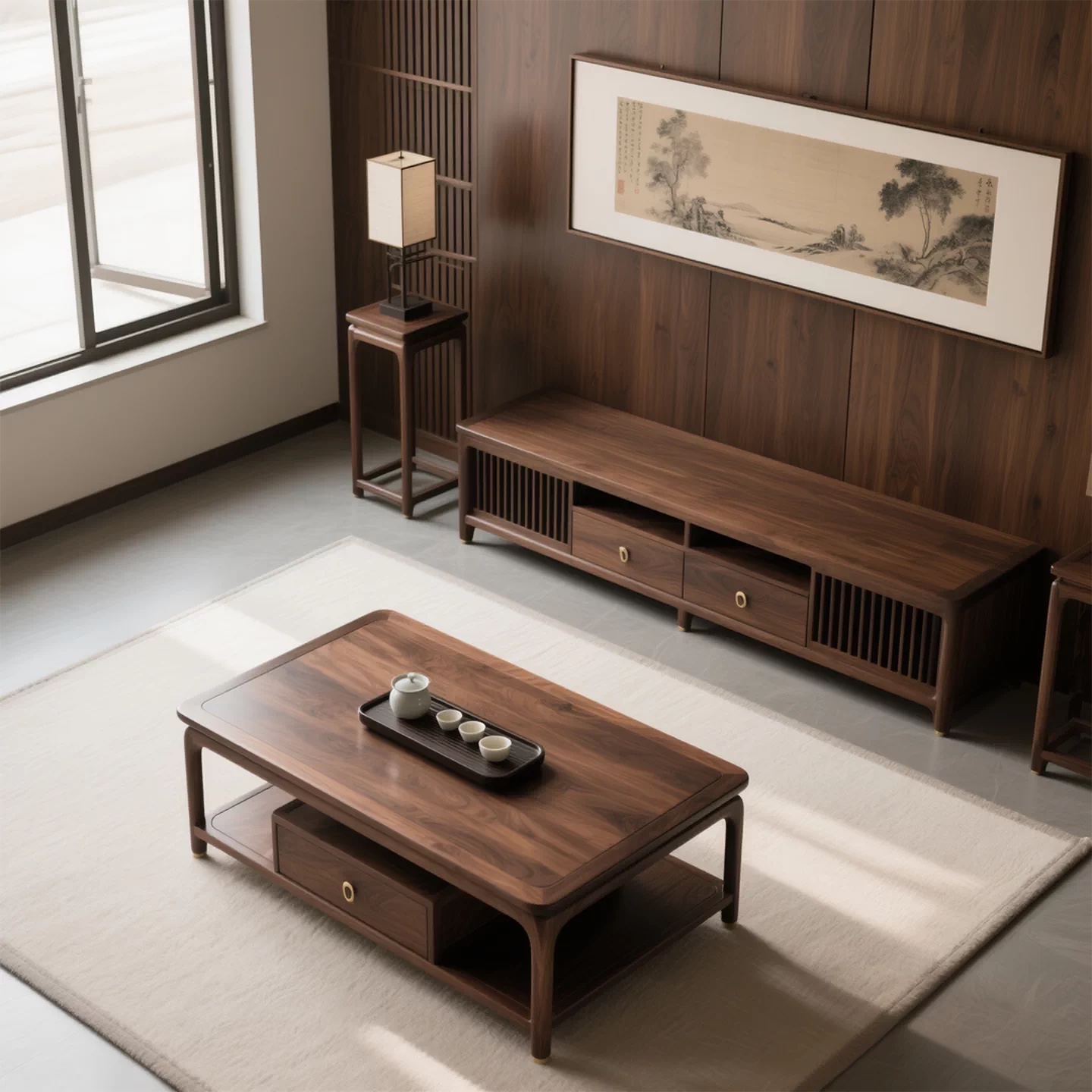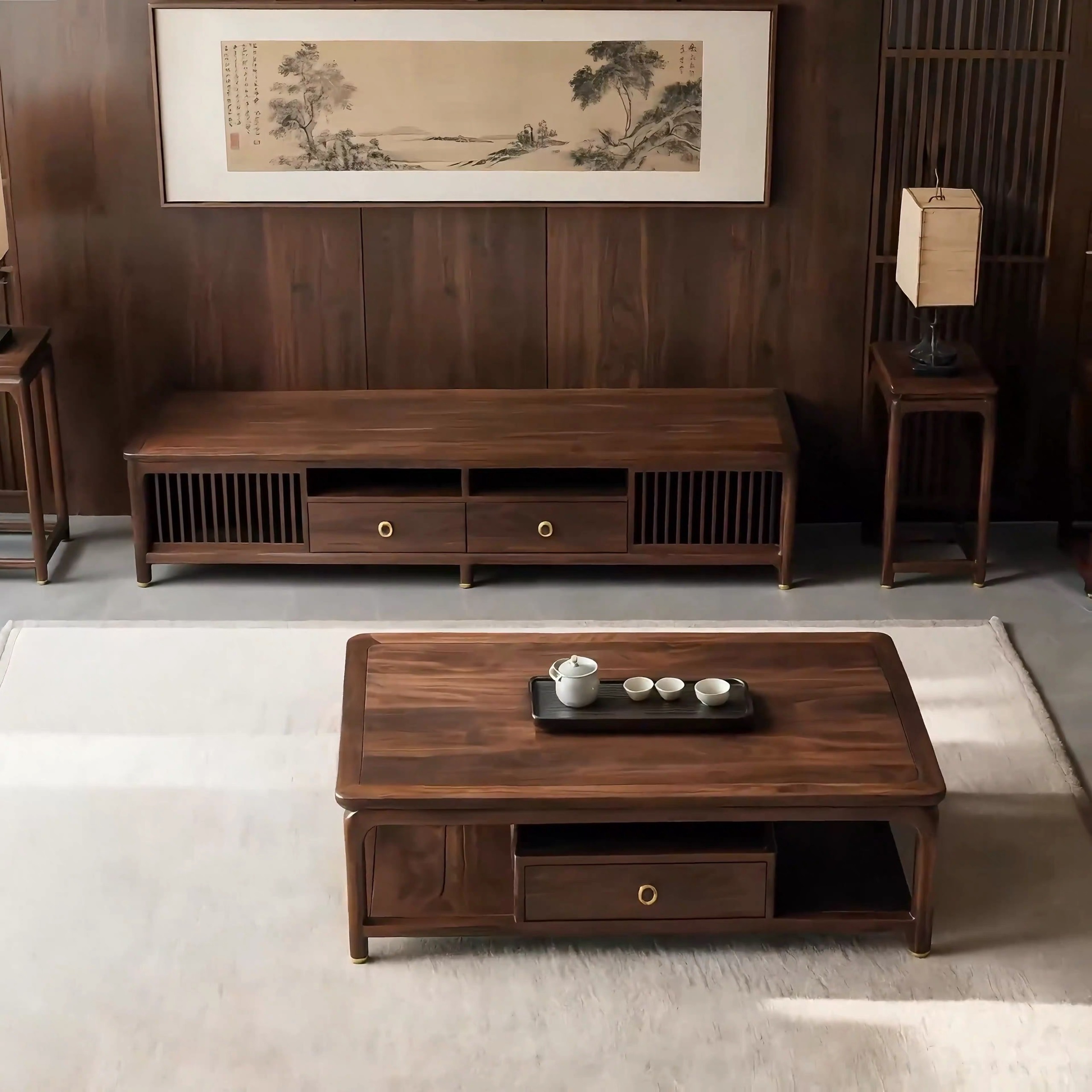 Thiết kế: Ngăn kéo chạm khắc họa tiết hình học + khoang chứa mở tiện lợi