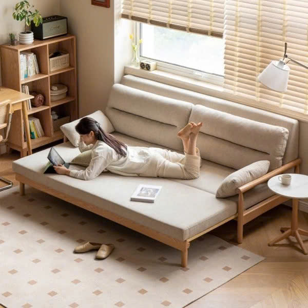 Sofa giường gỗ thông minh 2 trong 1, chuyển đổi linh hoạt từ sofa tiếp khách sang giường ngủ rộng rãi chỉ trong vài giây. Khung gỗ tự nhiên chắc chắn, kiểu dáng tối giản, tinh tế – phù hợp phòng khách, phòng ngủ, căn hộ nhỏ, homestay.