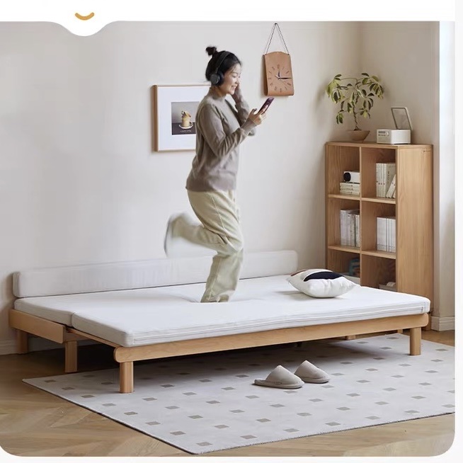 Sofa giường gỗ thông minh 2 trong 1, chuyển đổi linh hoạt từ sofa tiếp khách sang giường ngủ rộng rãi chỉ trong vài giây. Khung gỗ tự nhiên chắc chắn, kiểu dáng tối giản, tinh tế – phù hợp phòng khách, phòng ngủ, căn hộ nhỏ, homestay.