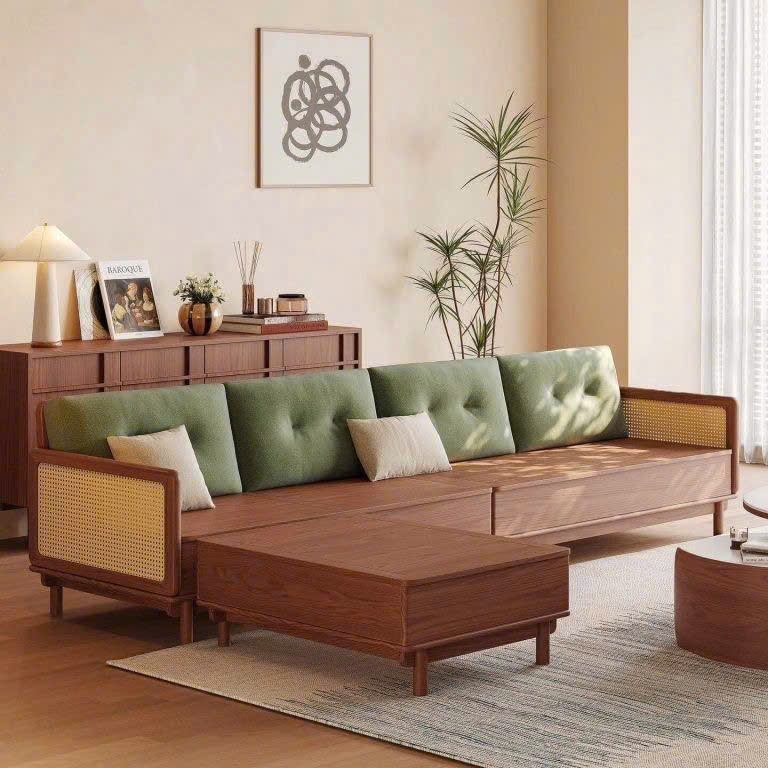 Sofa Gỗ VS77 Kèm Hộc Tủ – Sofa Gỗ Tự Nhiên Phòng Khách, Ghế Sofa Đệm Da Cao Cấp Hiện Đại