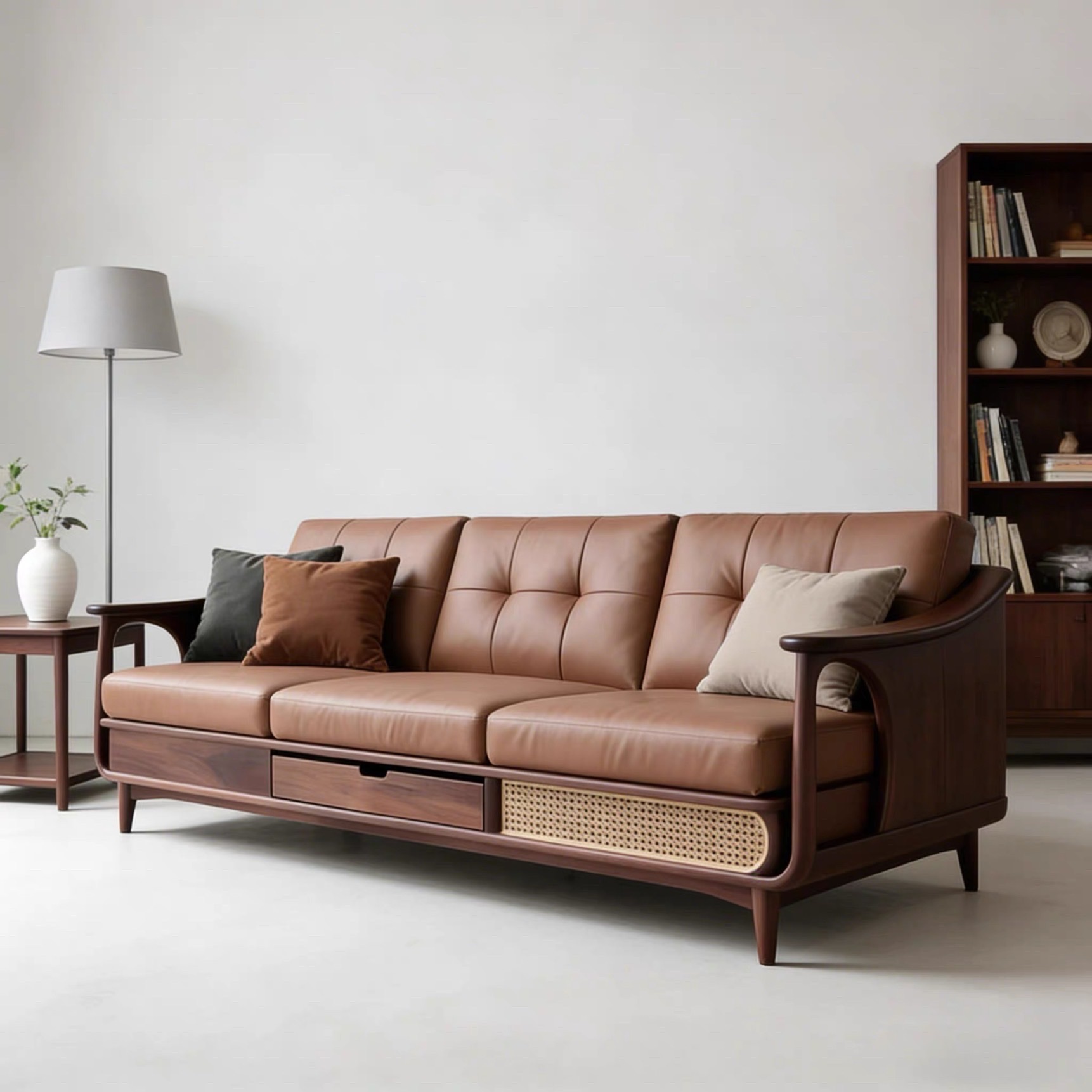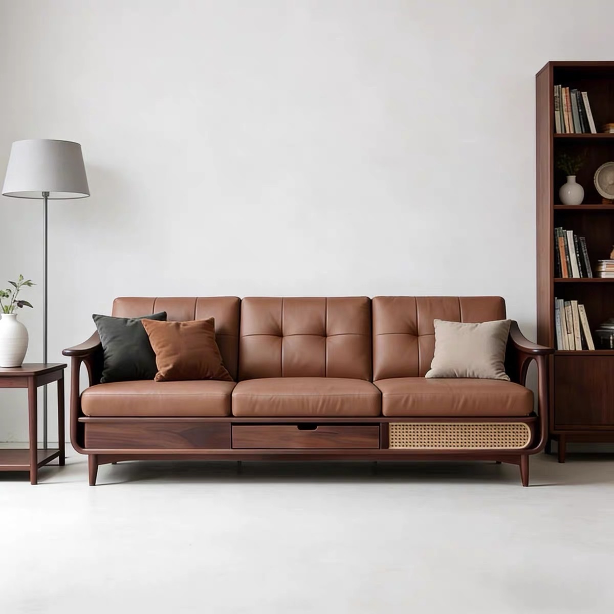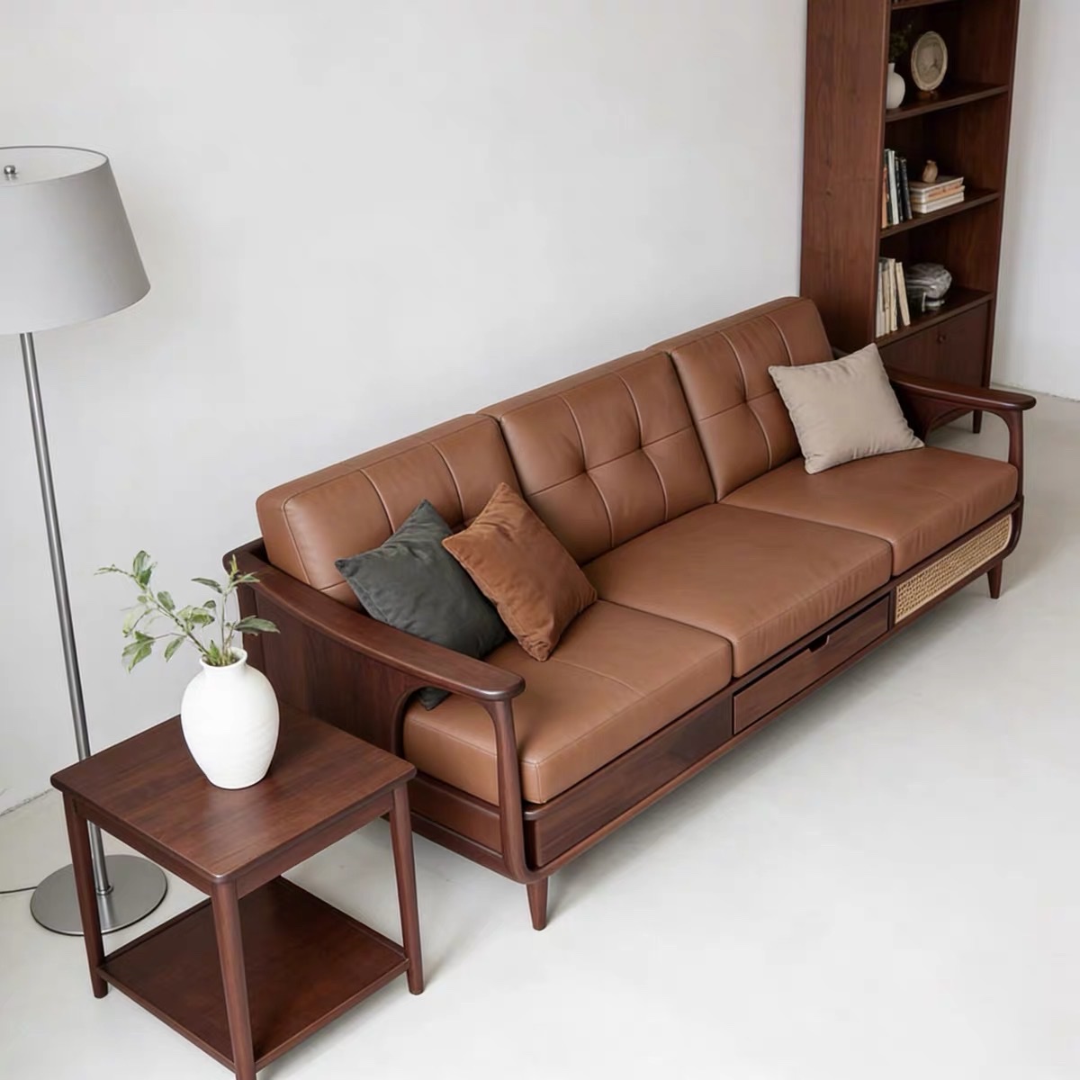 Sofa Gỗ VS98 Kèm Hộc Tủ – Sofa Gỗ Tự Nhiên Phòng Khách, Ghế Sofa Đệm Da Cao Cấp Hiện Đại