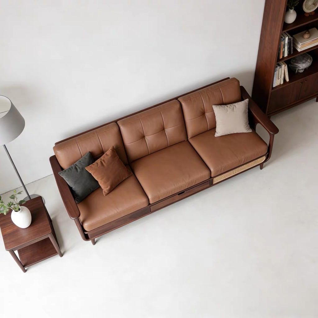 > Đệm ngồi và tựa lưng dày dặn, độ đàn hồi tốt giúp bạn thư giãn thoải mái khi ngồi lâu, xem phim hay tiếp khách. Tone màu gỗ ấm kết hợp đệm da nâu tạo cảm giác sang trọng, dễ phối nội thất và nâng tầm không gian sống.