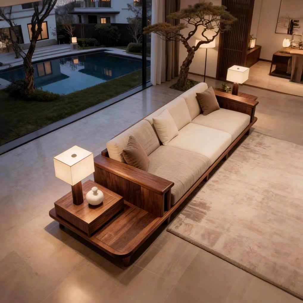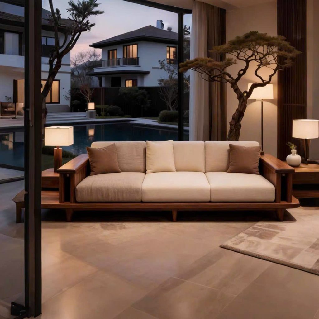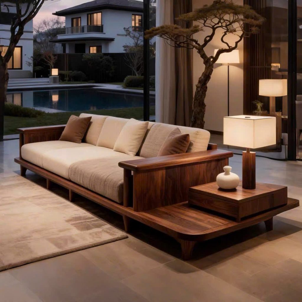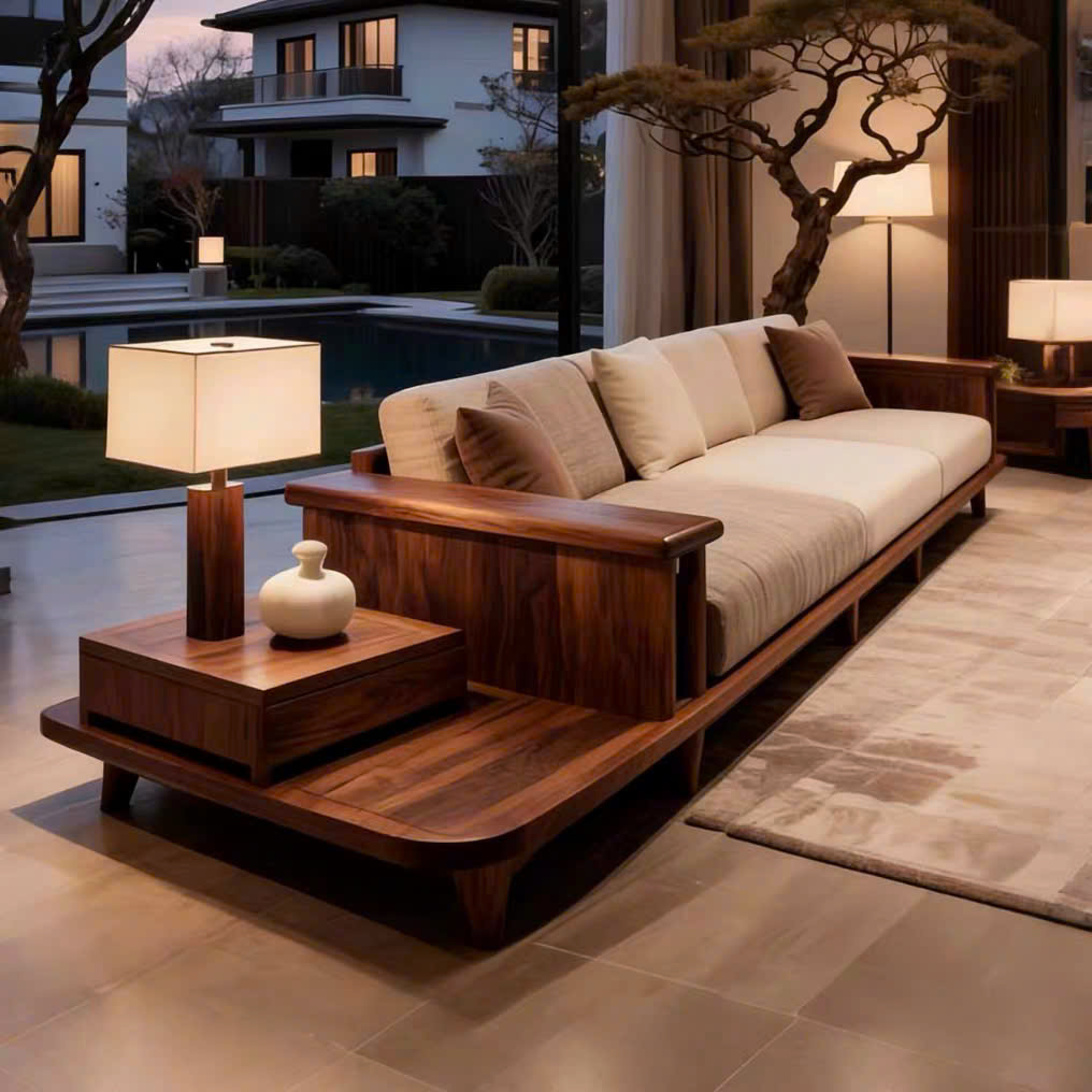 >>Sofa gỗ tự nhiên VS92 nổi bật với thiết kế khung gỗ uốn cong liền mạch đầy tinh tế, mang lại vẻ đẹp sang trọng và đẳng cấp cho không gian phòng khách. Phần khung được gia công tỉ mỉ từ gỗ tự nhiên chắc chắn, đường nét bo tròn mềm mại không chỉ tăng tính thẩm mỹ mà còn đảm bảo an toàn khi sử dụng. Kệ tủ tích hợp bên tay vịn giúp tối ưu không gian lưu trữ, tiện lợi để sách, điều khiển, đồ cá nhân hoặc vật dụng nhỏ, giúp phòng khách luôn gọn gàng