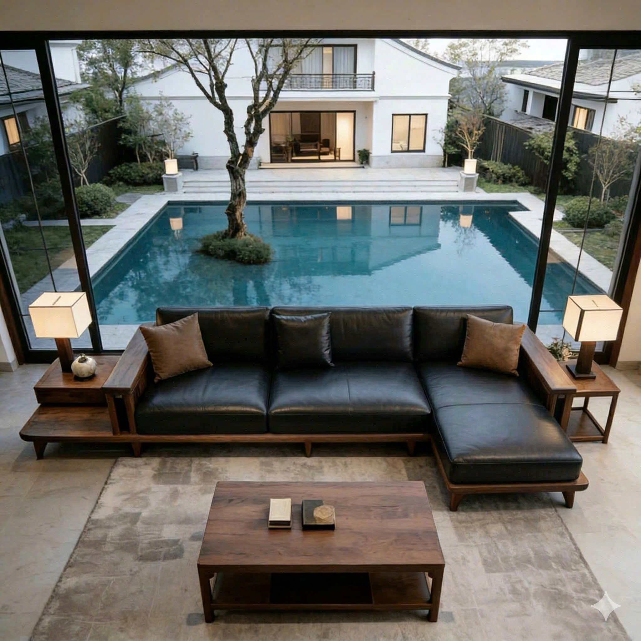 Sofa Gỗ Tự Nhiên VS92 Cao Cấp – Sofa Phòng Khách Khung Gỗ Kèm Kệ Đồ Có Đôn Sang Trọng, Đệm Da/Nỉ Êm Ái Phong Cách Hiện Đại