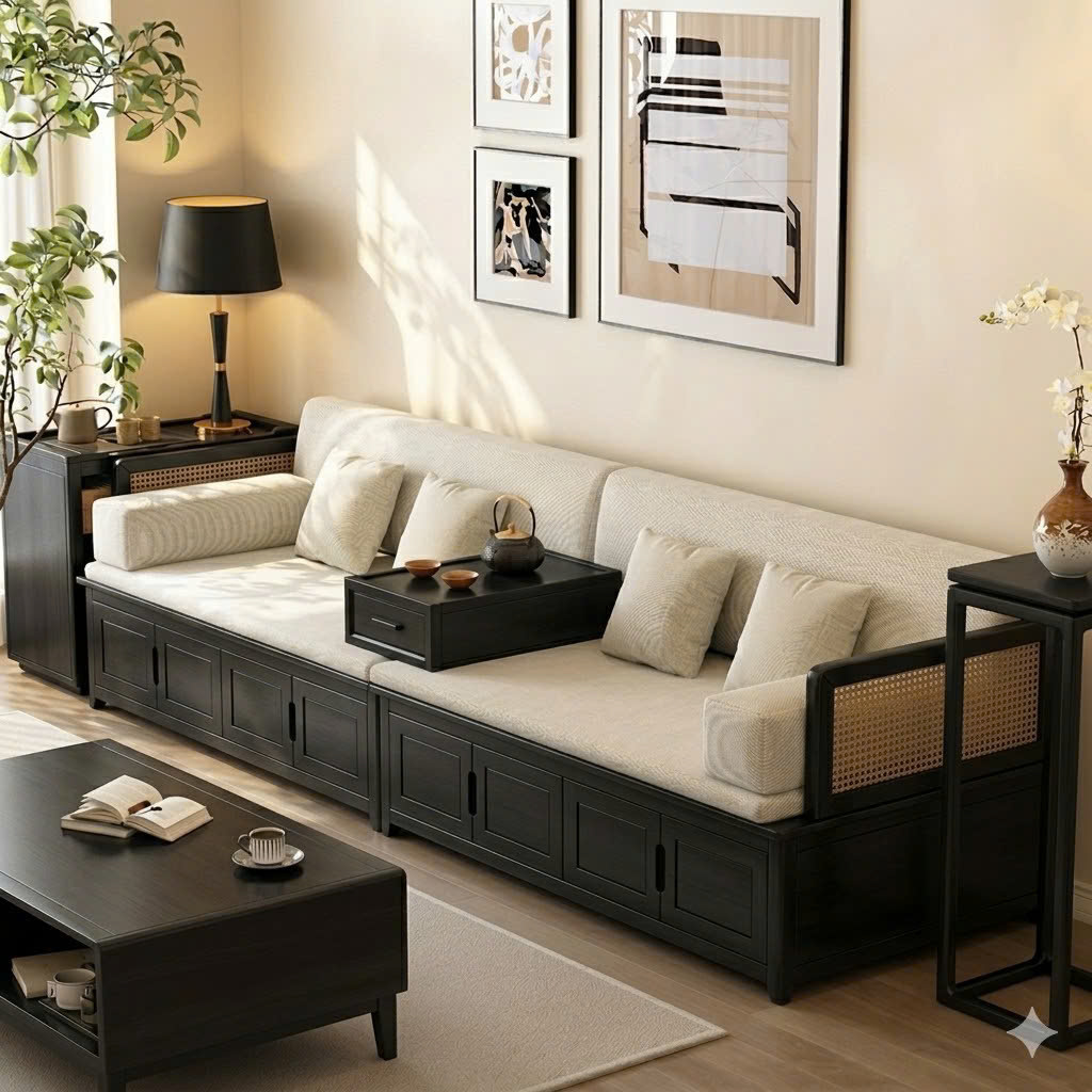 >Đệm ngồi và tựa lưng dày dặn,có ngăn kéo để đồ tiện ích, bọc da/da PU cao cấp (tùy chọn), mang lại cảm giác êm ái, thoáng mát và dễ vệ sinh. Thiết kế tay vịn thấp ,gối tựa tròn tạo điểm nhấn hiện đại, đồng thời nâng cao trải nghiệm thư giãn khi ngồi hoặc nằm nghỉ.