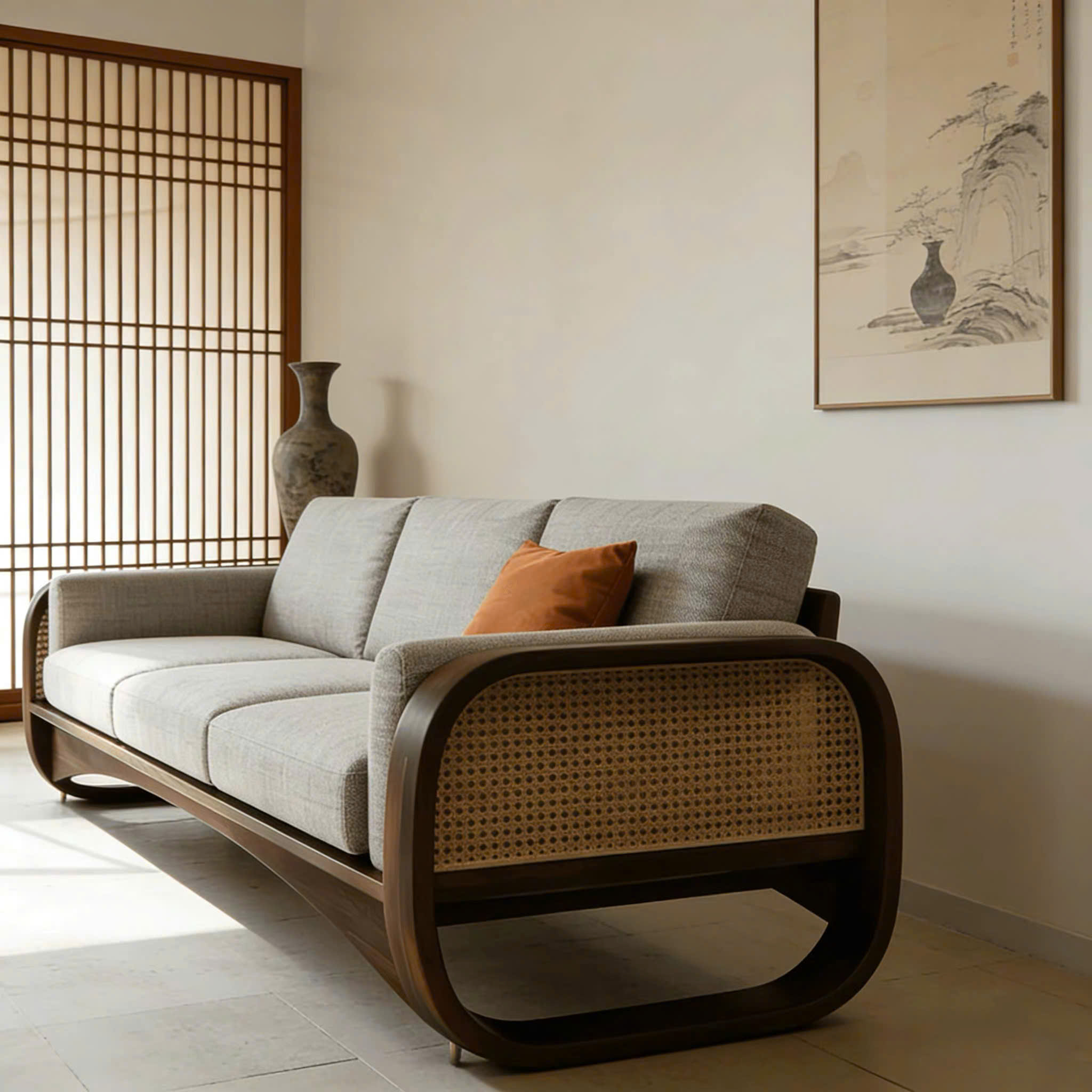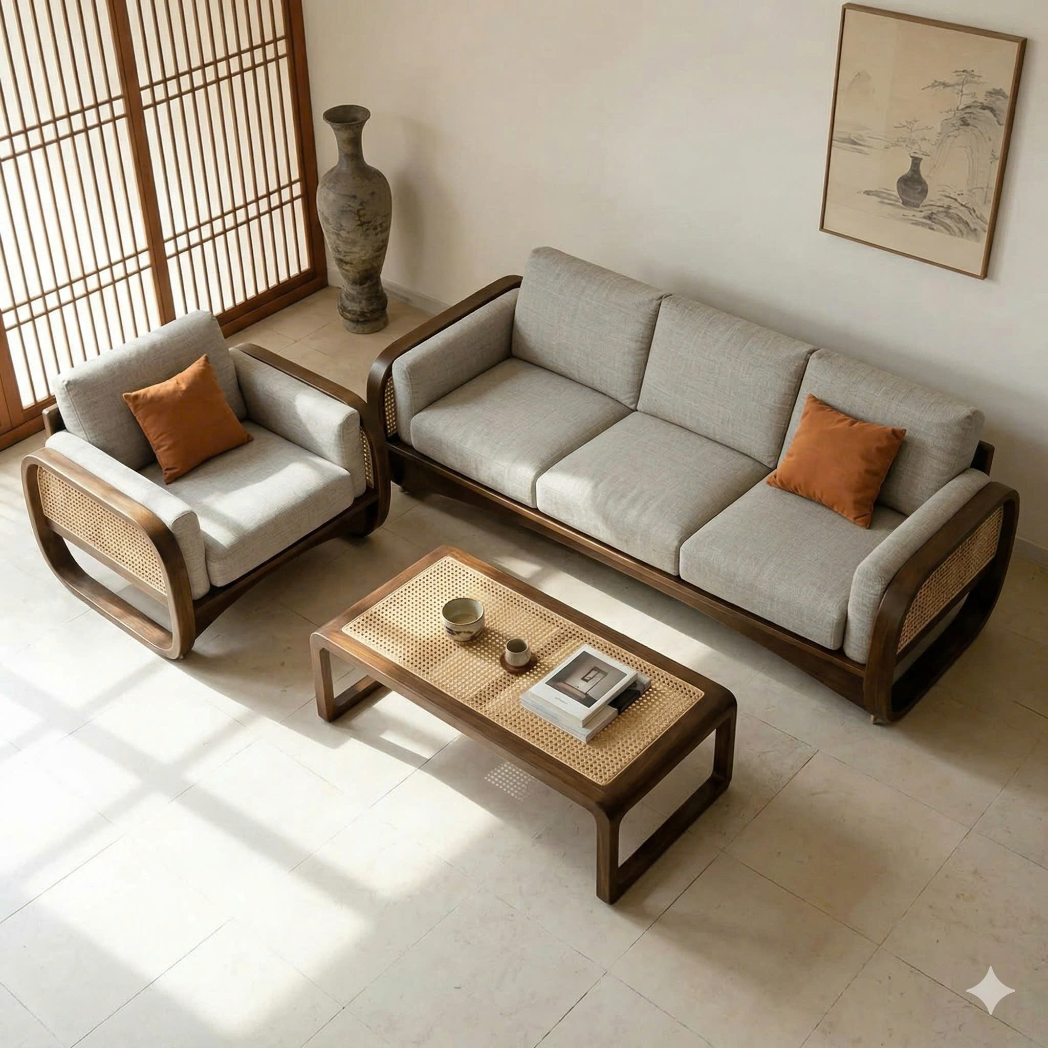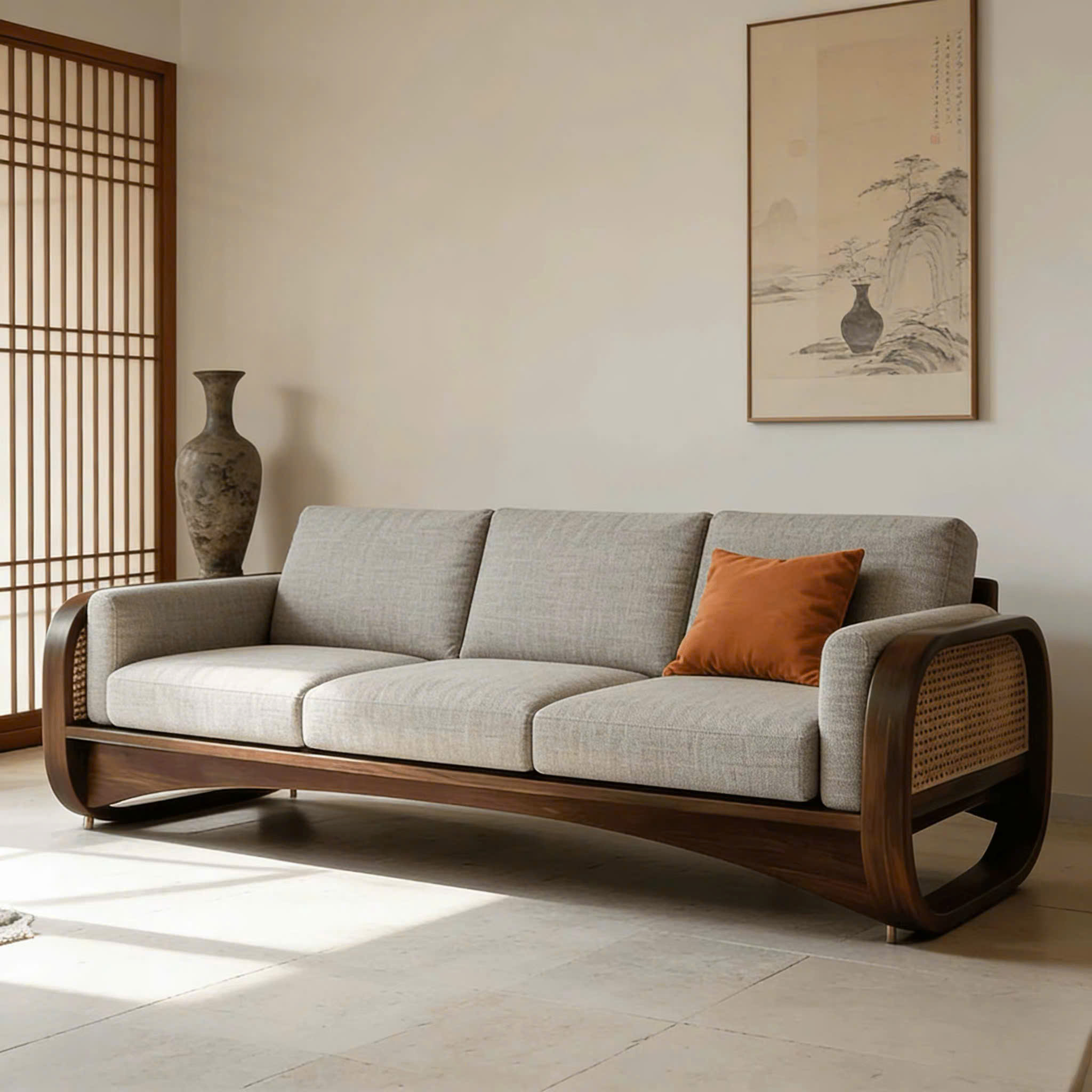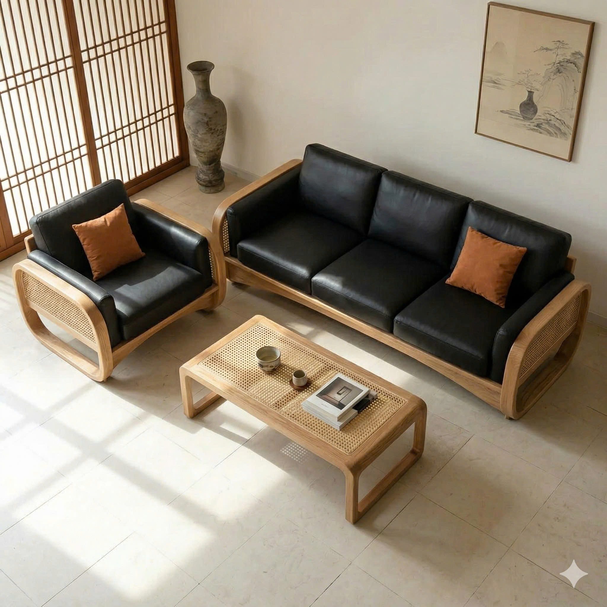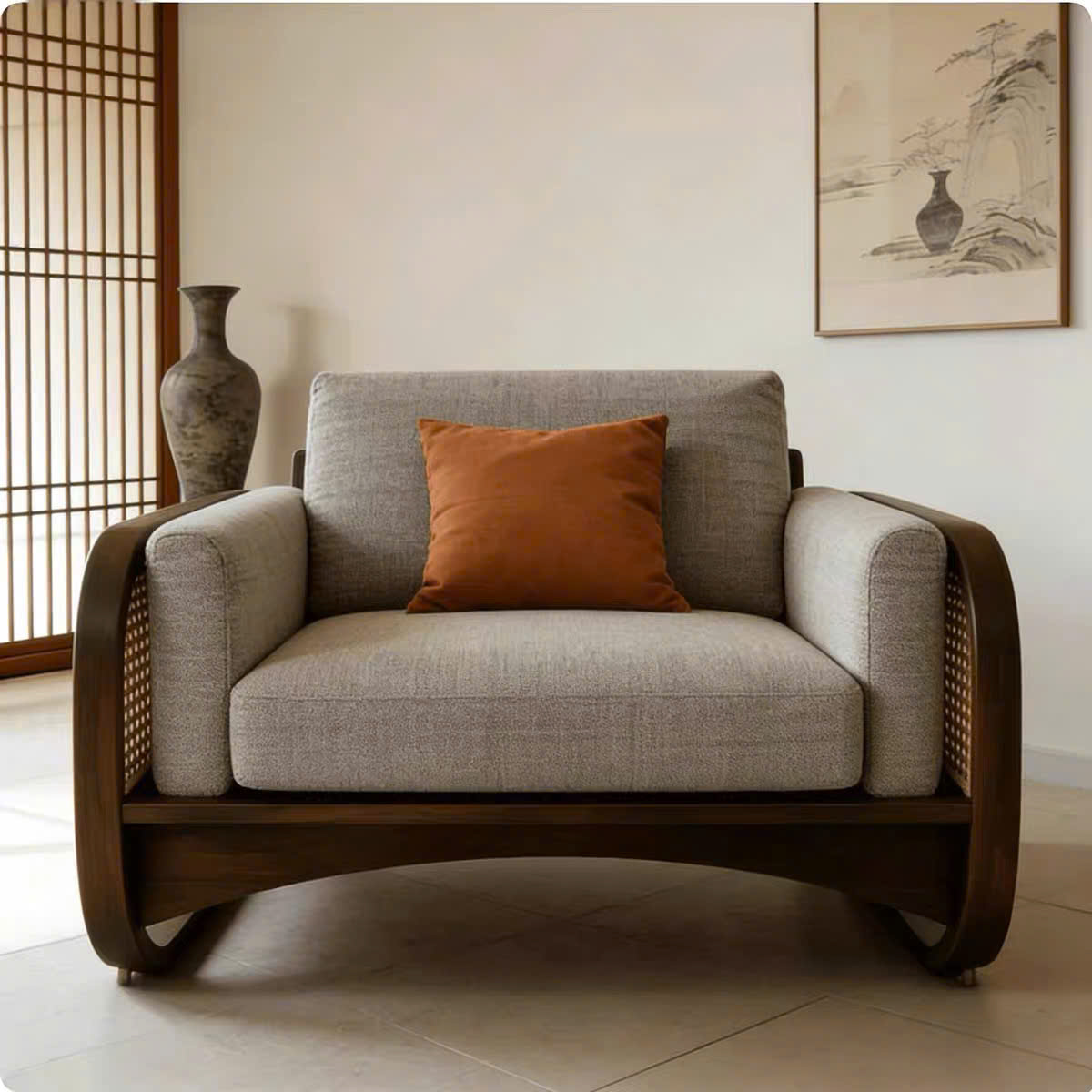 Sofa Gỗ Tự Nhiên VS97 Cao Cấp – Sofa Phòng Khách Khung Gỗ phối Mây Uốn Cong Sang Trọng, Đệm Da/Nỉ Êm Ái Phong Cách Hiện Đại !