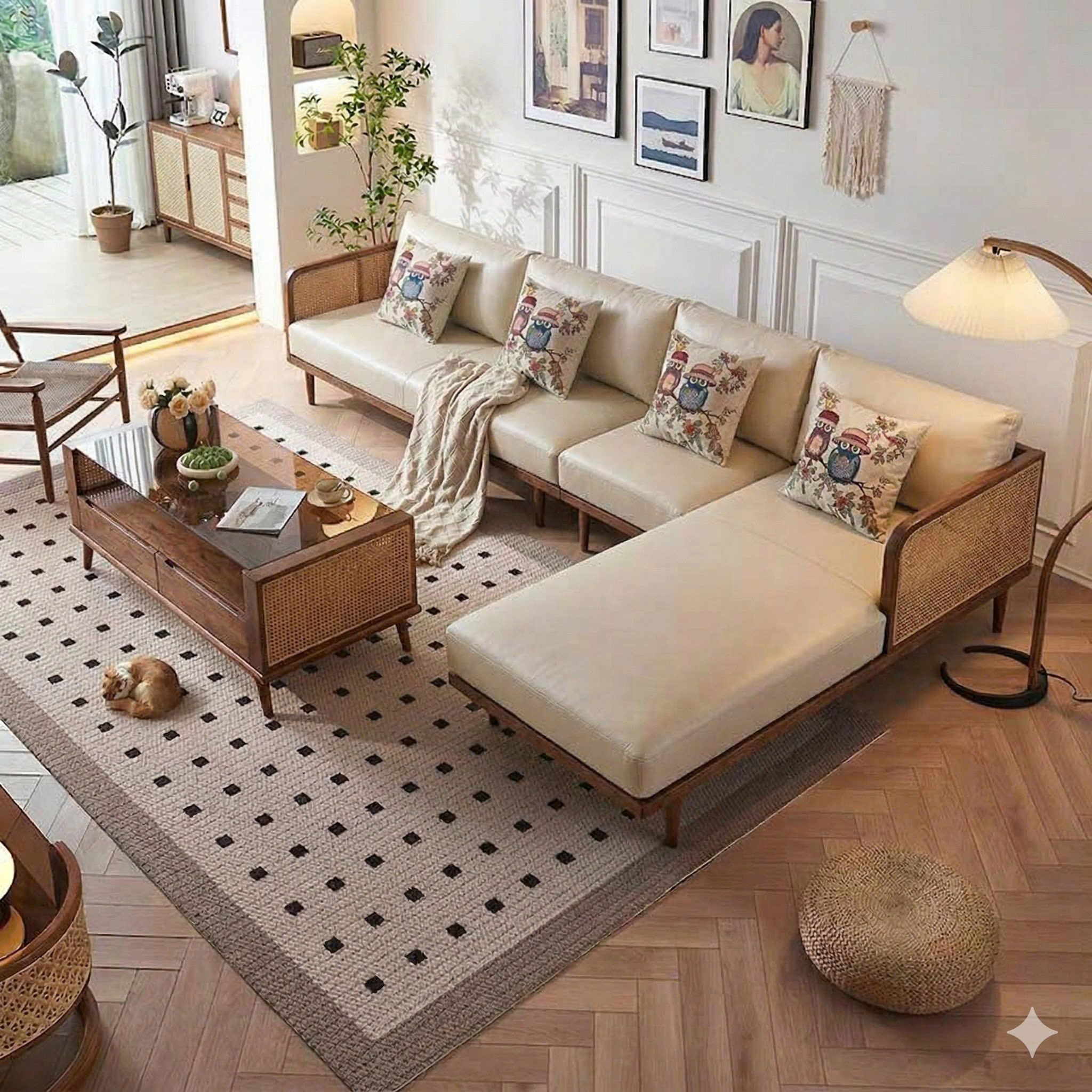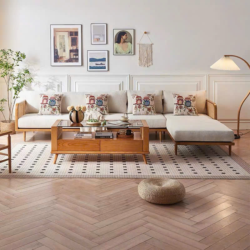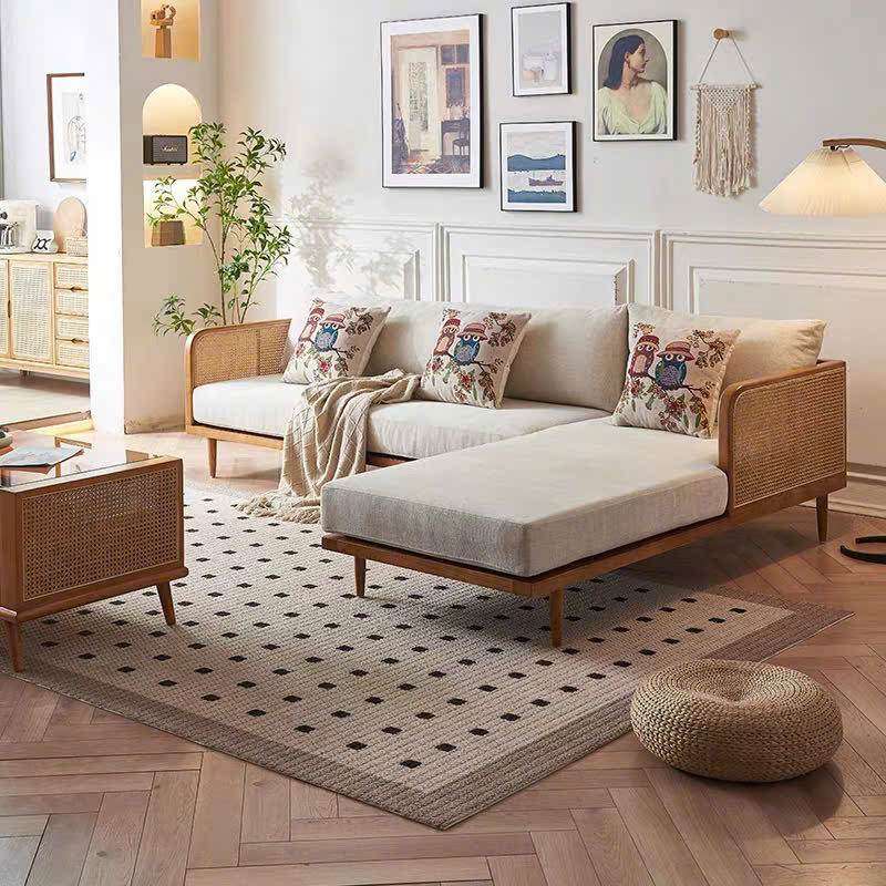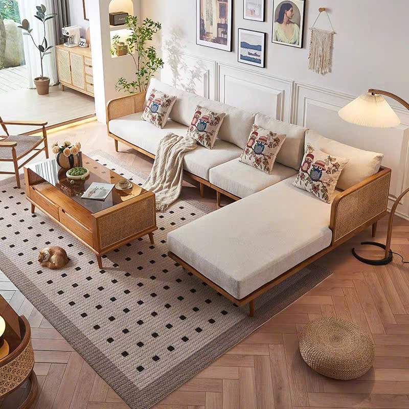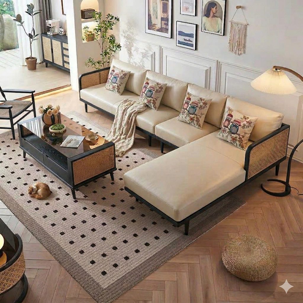 Bộ Sofa Góc Gỗ Phối Mây VS112 – Sofa Gỗ Tự Nhiên Phòng Khách, Ghế Sofa Đệm Da Cao Cấp Hiện Đại