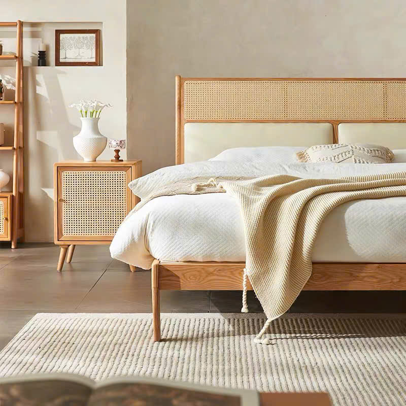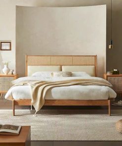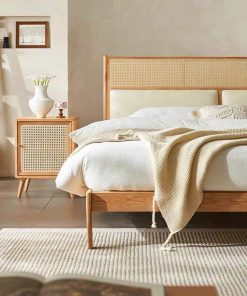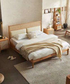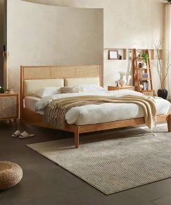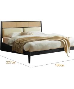 Giường ngủ Gỗ tự nhiên phối mây ốp đệm da VGT04 VUADECOR phong cách vintage, indochine màu sắc kích thước theo yêu cầu