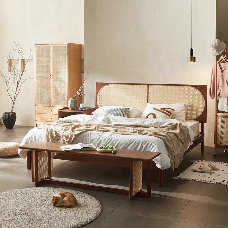 Chiếc giường gỗ phối mây mang phong cách Modern – Classic, tạo điểm nhấn nổi bật cho không gian nhờ sự kết hợp giữa: