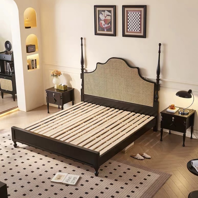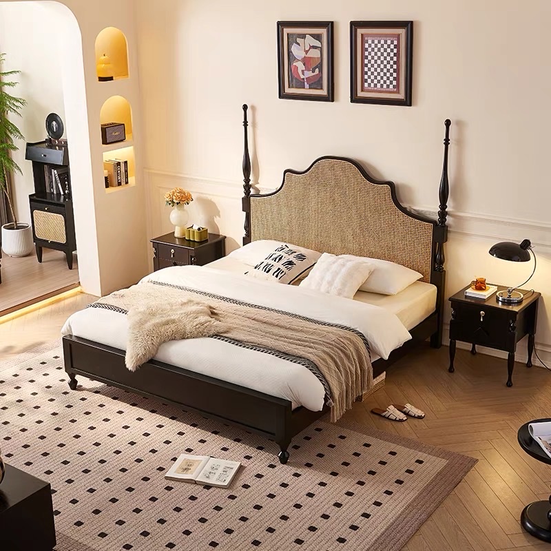 Chiếc giường gỗ phối mây mang phong cách Modern – Classic, tạo điểm nhấn nổi bật cho không gian nhờ sự kết hợp giữa: