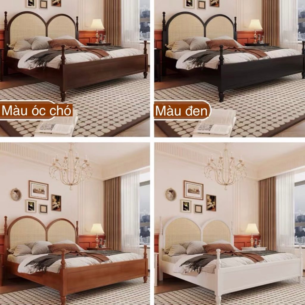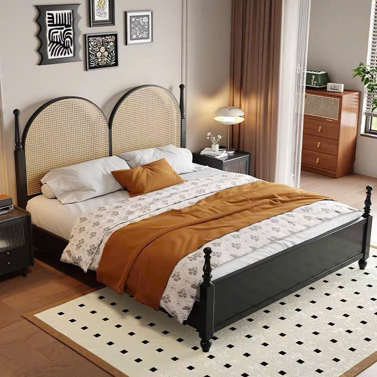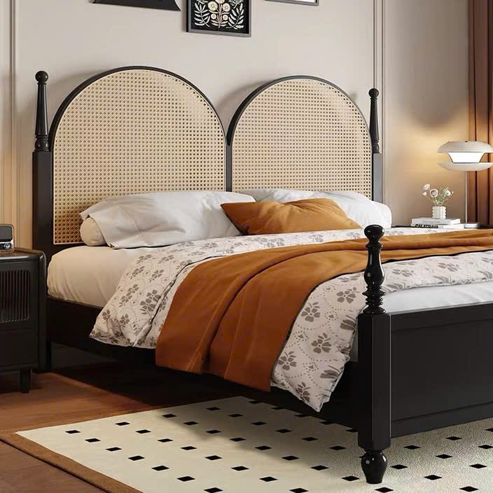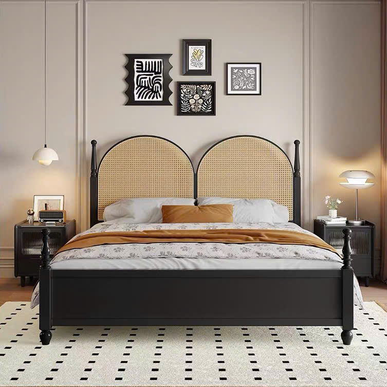 Chiếc giường gỗ phối mây mang phong cách Modern – Classic, tạo điểm nhấn nổi bật cho không gian nhờ sự kết hợp giữa: