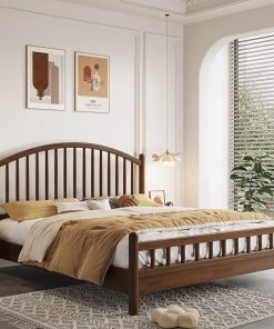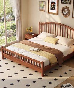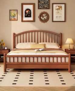 Giường gỗ VG45 nổi bật với thiết kế đầu giường khung nan gỗ, kết hợp trụ tiện hai bên tạo điểm nhấn cổ điển đầy tinh tế. Tone gỗ nâu ấm áp giúp không gian phòng ngủ trở nên ấm cúng – sang trọng – đẳng cấp.